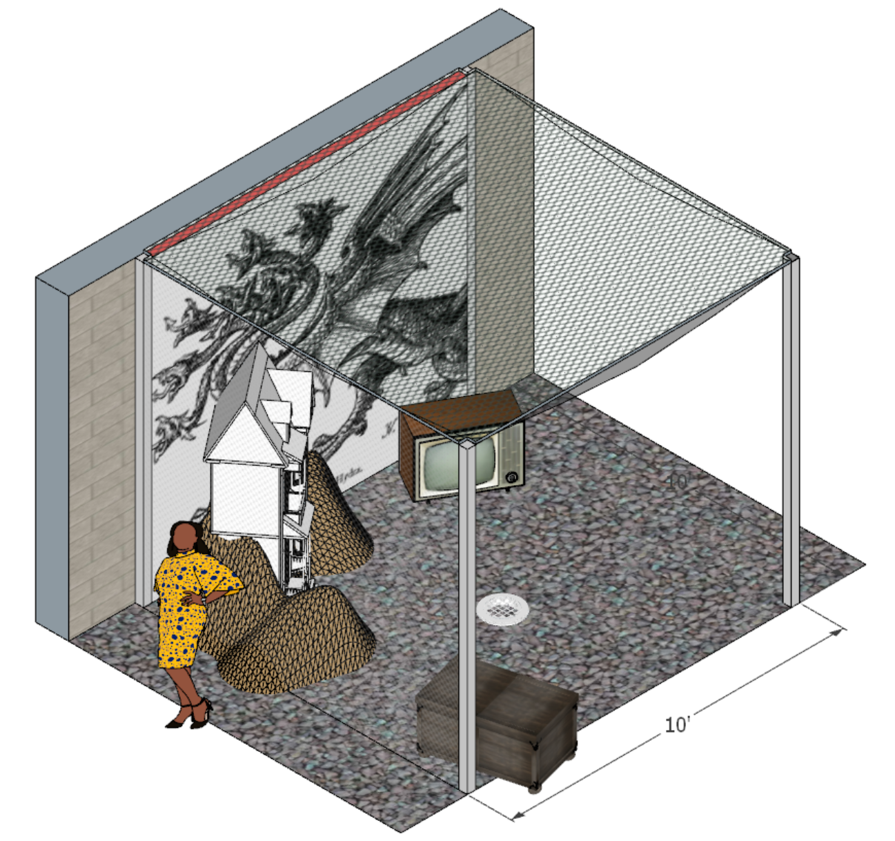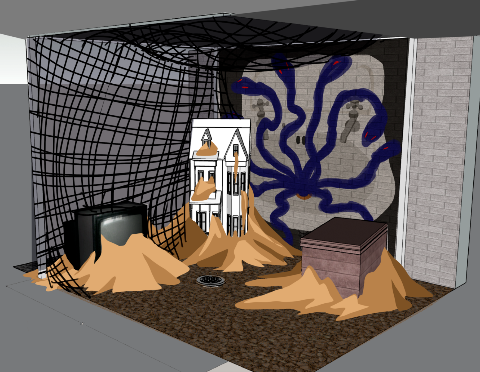 Mural mockup for devised theatre production, was later projected onto exterior set wall and painted in acrylic/latex, 2021